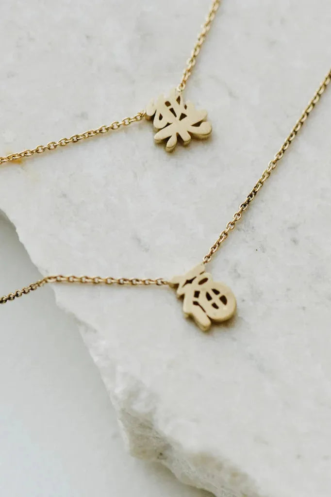 Discover the exquisite Blessings 18K Gold Chinese Character Necklace by Rhapsody in Gold. Handcrafted with love and precision, this stunning piece of gold jewellery is a true symbol of blessings and prosperity. Let this handcrafted necklace signify the abundance of blessings and good fortune in your life.