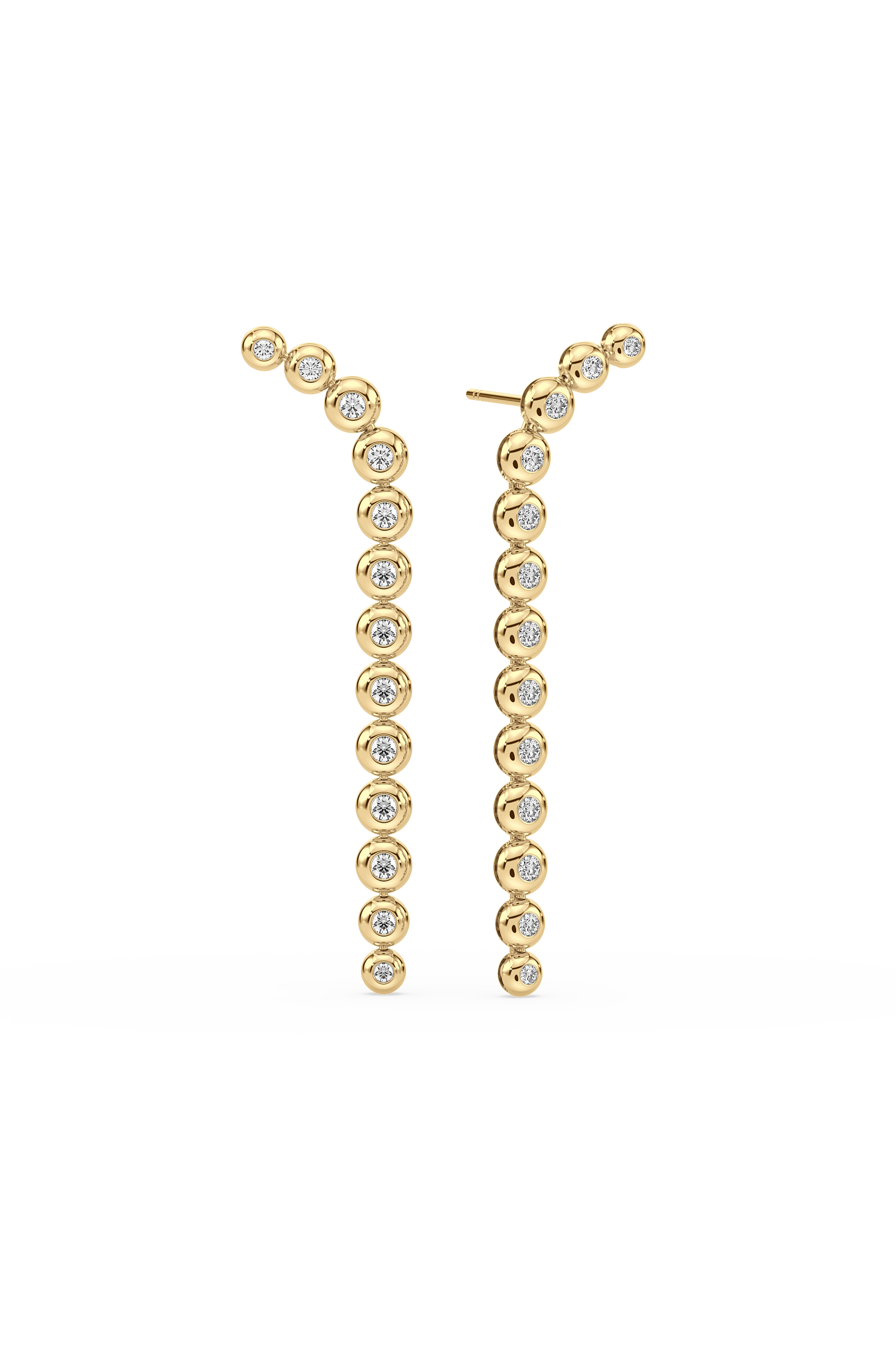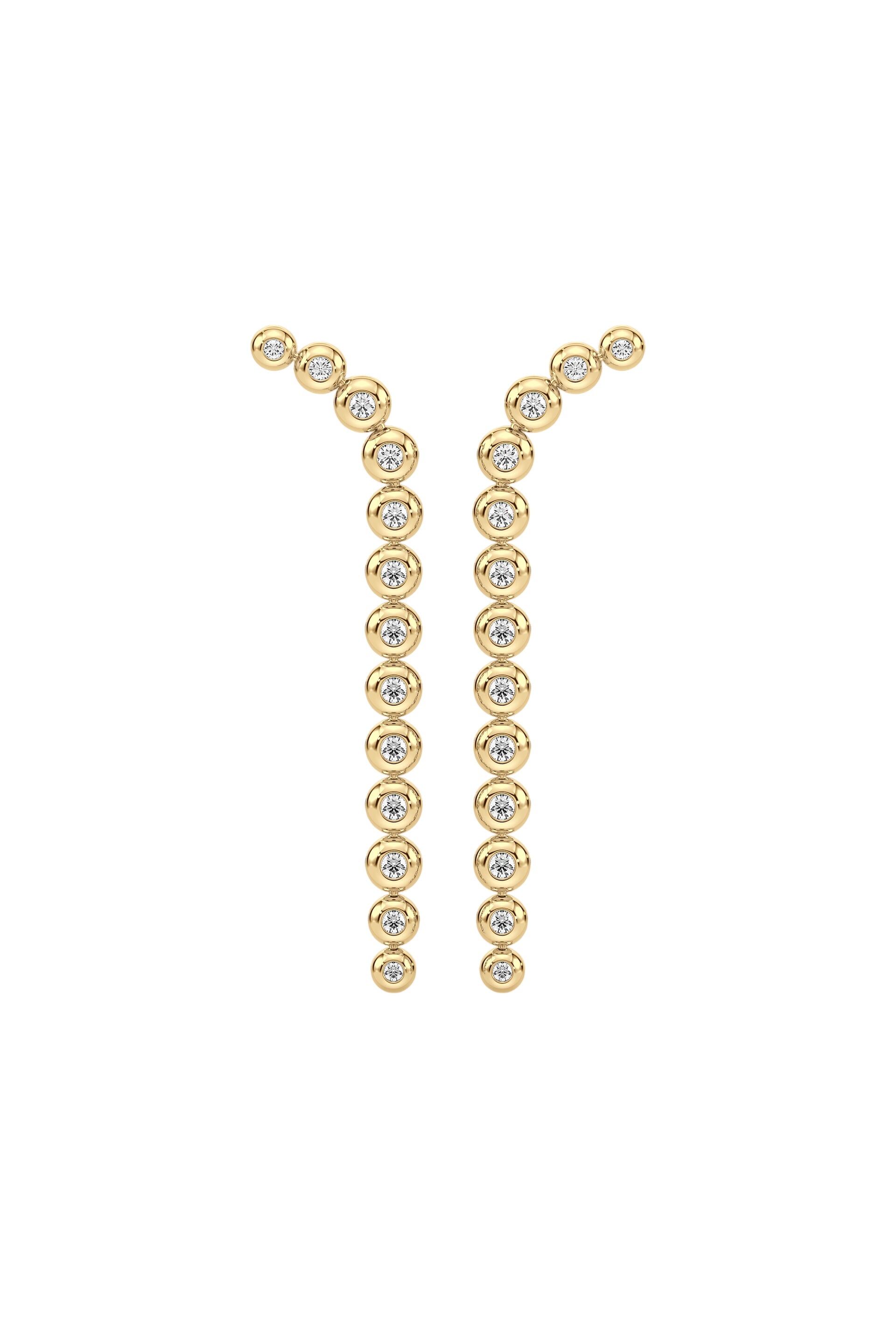 The bubble pendant earrings feature a crescendo of diamonds, each diamond is comfortably set in a gold rounded cushion.