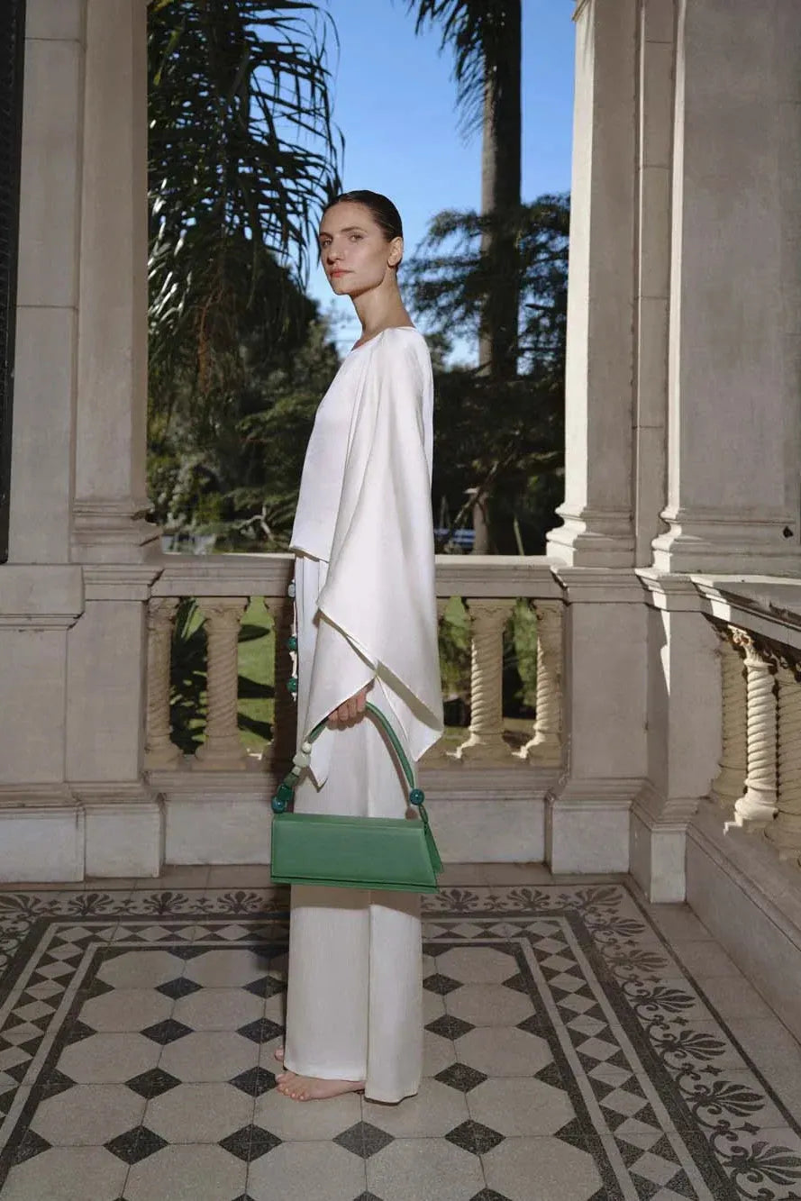 Hand wash your garment inside out, soaking it gently in cold water for 5-10 minutes, then rinse. Lay flat to dry in the shade to preserve both the fabric and shape. Do not tumble dry, bleach, or dry clean, and avoid high temperatures and contact with rough surfaces or accessories.
