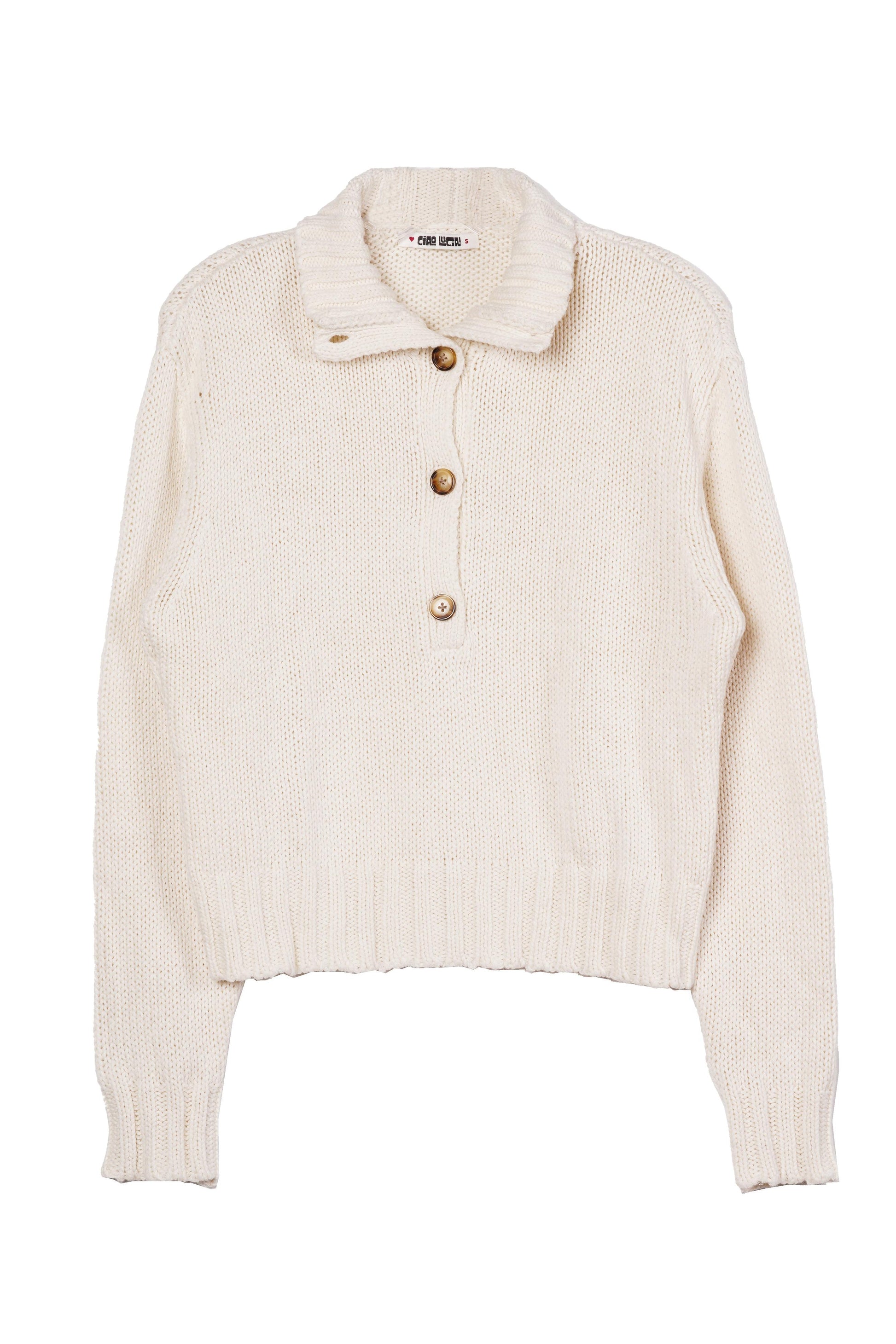 The Carina Pullover in White is a slightly cropped, cotton knit polo style pullover sweater featuring a button-up collar.