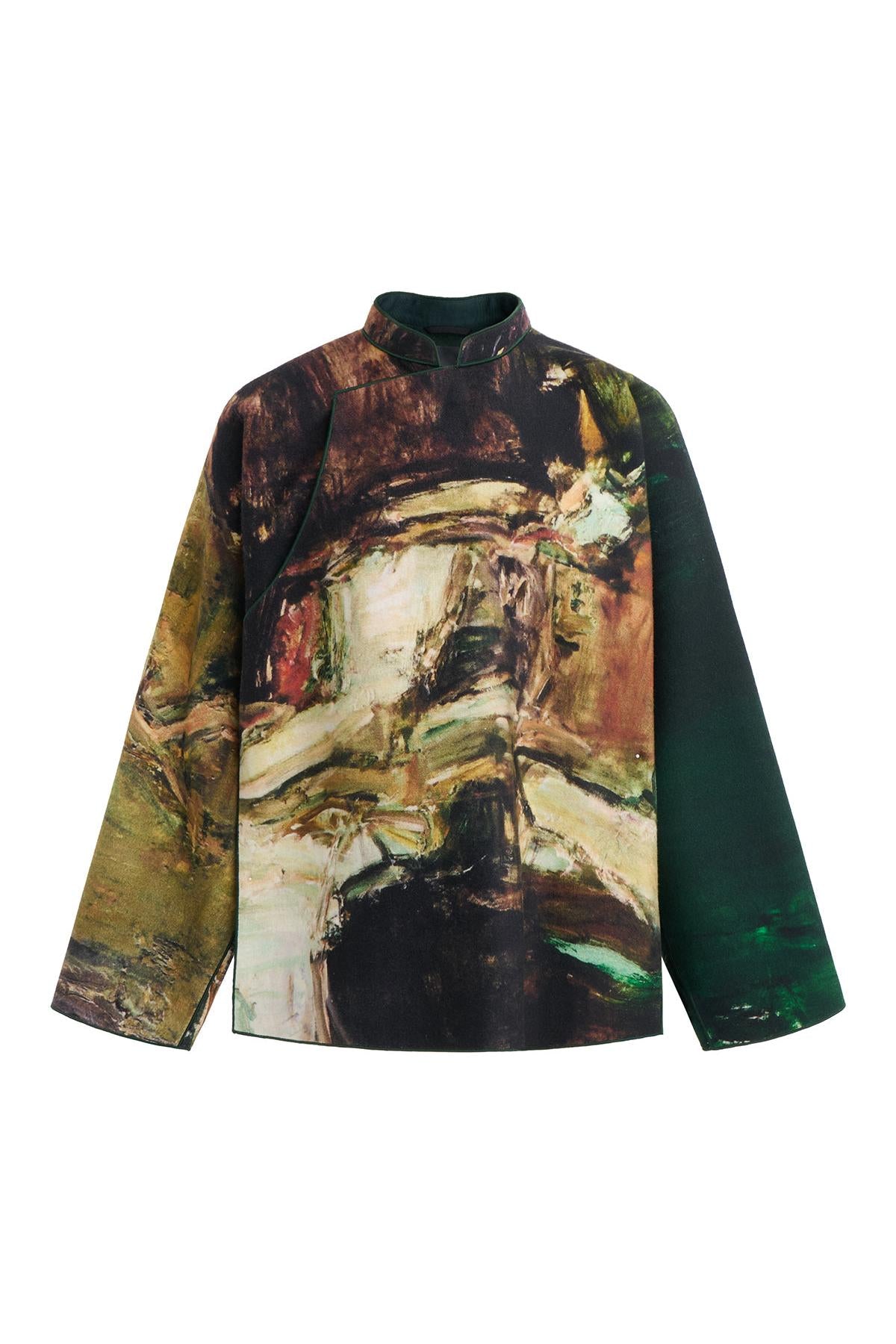 Dark Green Dragon Oil Paint Wool Printed Chinese Jacket