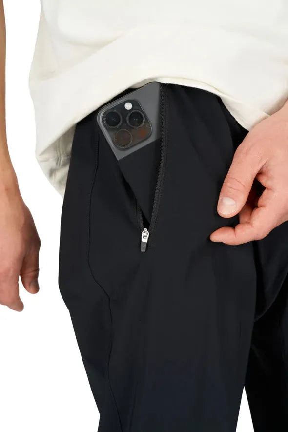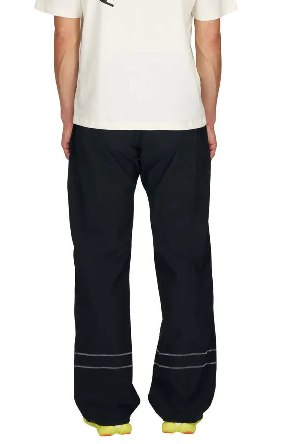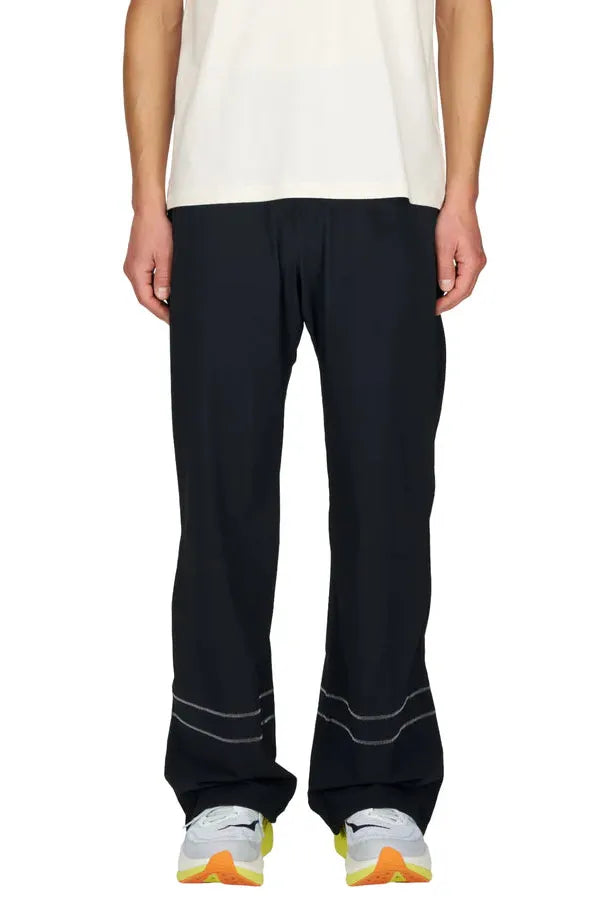 UNISEX Wide running pants in Black with a soft stretch, two front pockets and a smart hidden pocket to keep your phone in place. Two reflective contrast seams around the bottom of each leg. Elasticated waist and hem with cord stoppers. Made in Econyl.