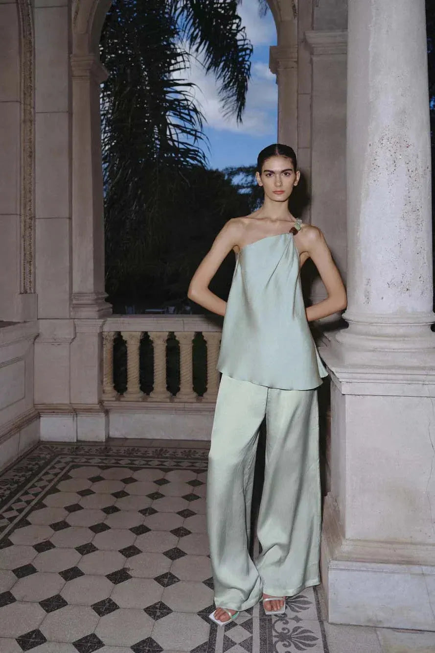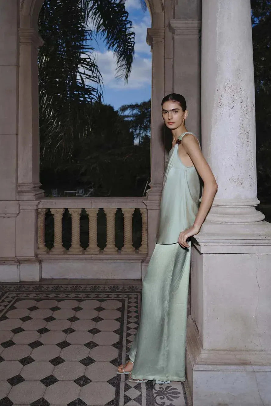 Hand wash your garment inside out by soaking it gently in cold water for 5-10 minutes, then rinse. Lay flat to dry in the shade to preserve both the fabric and its shape. Do not tumble dry, bleach, or dry clean, and avoid high temperatures and contact with rough surfaces or accessories.