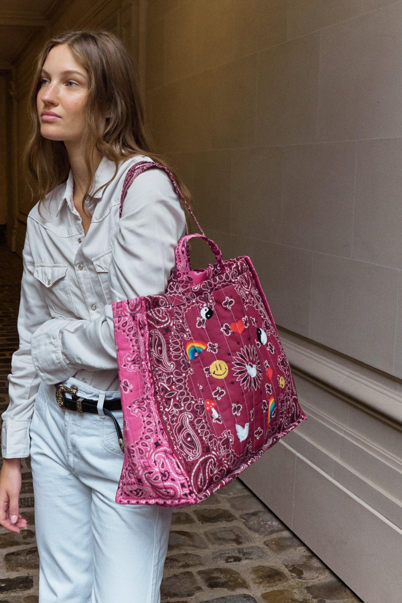 Dimensions: L 49 x H 39 x D 19 cm. Shoulder strap length: 58 cm. Hand strap length: 22 cm. Composition: 100% cotton. Bandanas made in the USA. Bag made in Europe. Care: Clean inside out or in a bag to avoid damaging the embroidery. Hand wash at 30 degrees without soaking. Do not machine dry, prefer to dry flat in the open air. Our bandanas are handcrafted. Dye baths may vary slightly from one production to another.