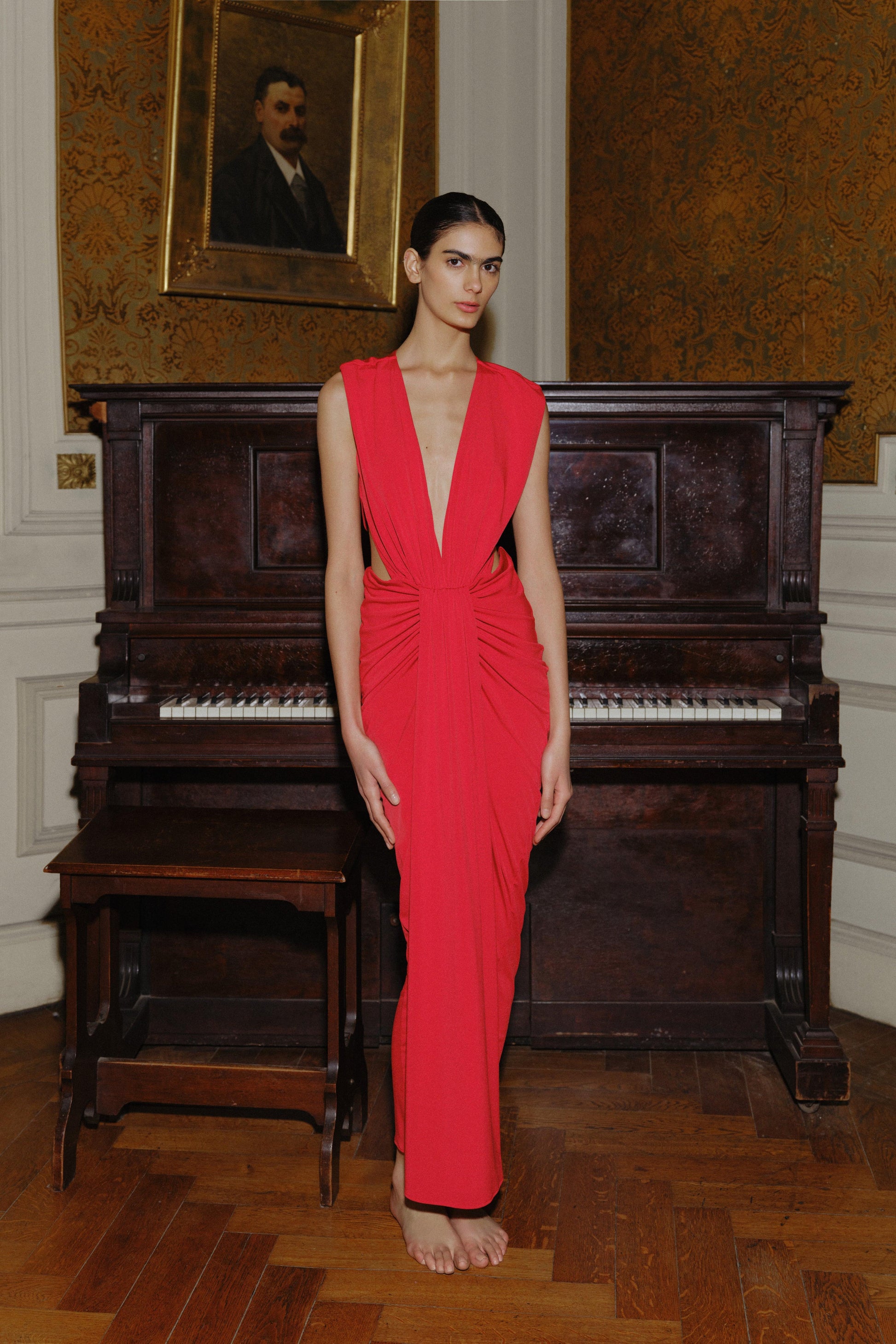 Introducing the "Nia Dress" in Orange Red – This maxi dress features a deep V-neckline, open back, and side cutouts for a bold, elegant silhouette. The ruched design, shiny fabric, and cascading detail create a glamorous touch, while the side slit adds allure. Perfect for making a sophisticated statement.