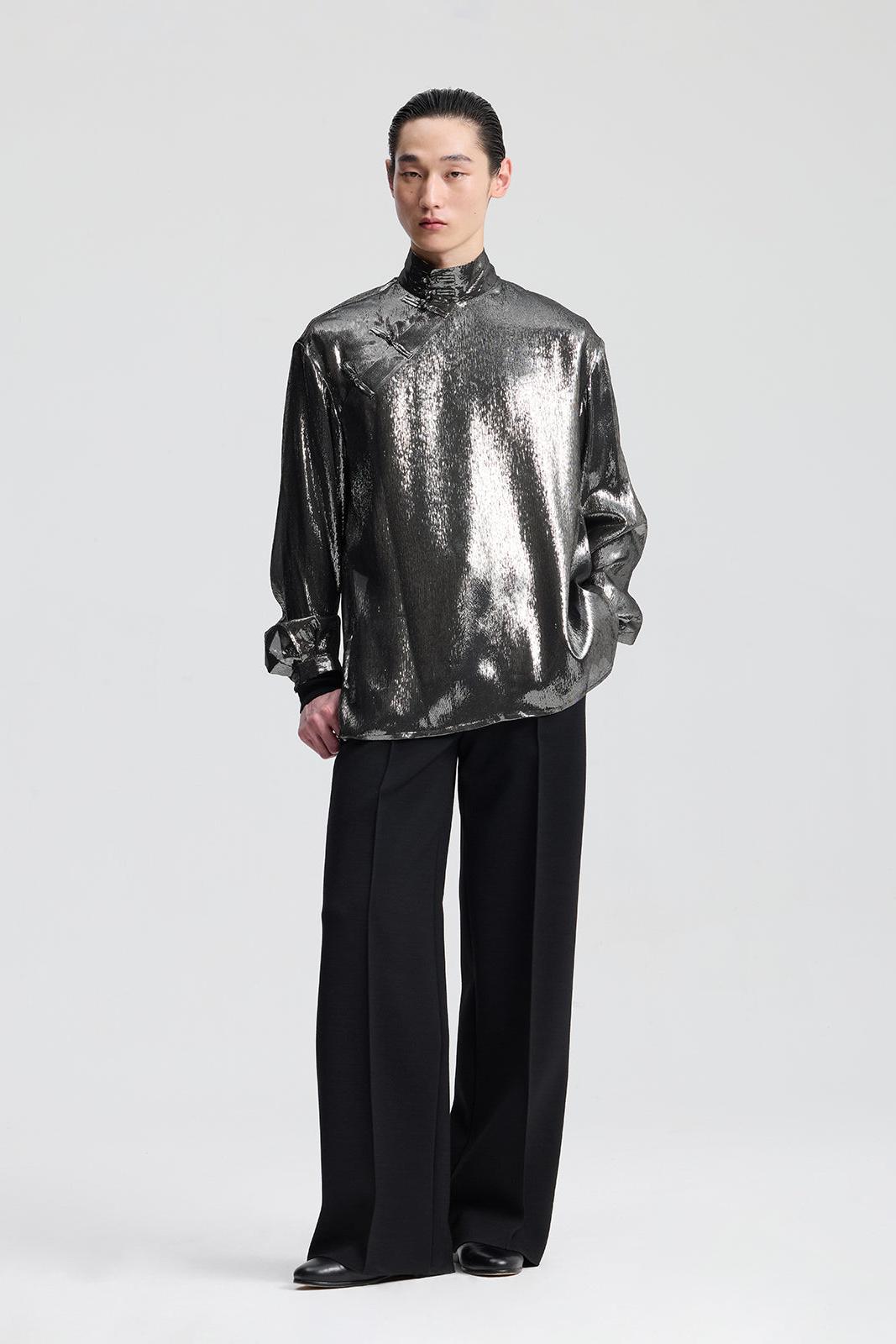 Shimmering Silver Loose-Fit Silk Chinese Shirt